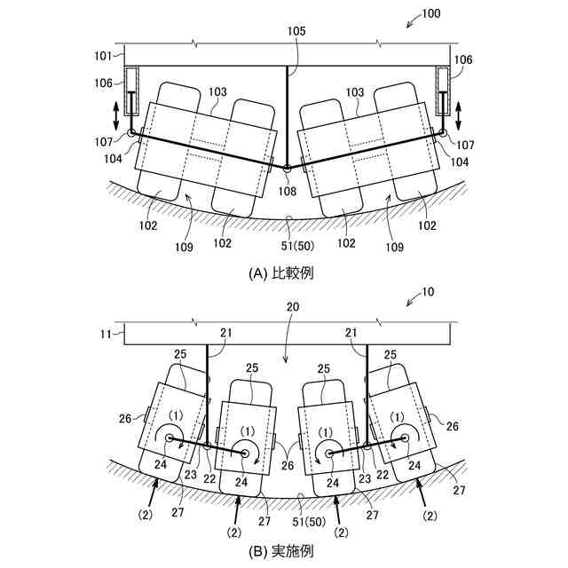 一般的に、バンクの湾曲部を転圧する場合、図6(A)に示されるように、比較例の斜面用ローラ100は、車体101の中央に設けられた固定部105と車体101の左右端に設けられたシリンダ106との間に左右方向に延びる2本の後車軸104を設け、2本の後輪軸104にそれぞれ2個ずつ取付けられた合計4個のローラ車輪102でバンク51の湾曲面を転圧する。固定部105にジョイント108を介して後車軸104の一端が揺動可能に設けられ、シリンダ106のピストンの下端に支持軸107を介して後車軸104の他端が回転可能に設けられ、シリンダ107を昇降させることでローラ車輪102の角度を湾曲面の形状に一致させる。