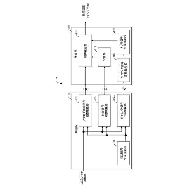 (1)上記の目的を達成するために、本発明は、以下のような手段を講じた。すなわち、本発明の基地局装置は、アナログRoF(Radio over Fiber)方式が適用されたフロントホールで接続された集約局と張出局を備える基地局装置であって、前記集約局は、各信号間の同期タイミングを調整するための同期信号を生成する同期信号生成機能部と、前記同期信号を基に、上位レイヤから送信された無線信号および前記無線信号を制御する制御信号を含む上位レイヤ信号を、アナログ波形であるアナログ無線信号に変換するアナログ無線信号変換機能部と、前記アナログ無線信号と同期したタイミングで切り替わるタイミング信号を生成するタイミング信号生成機能部と、前記制御信号から、張出局側で前記アナログ無線信号を制御するための張出制御信号を抽出する制御信号変換機能部と、を備え、前記張出局は、取得した前記張出制御信号を蓄積する記憶部と、前記タイミング信号が切り替わったタイミングで前記制御信号を読み出すトリガ信号を生成するトリガ信号生成機能部と、前記トリガ信号に基づき、前記記憶部に蓄積された張出制御信号を読み出し、前記アナログ無線信号を制御する制御機能部と、を備えることを特徴としている。