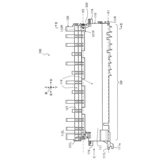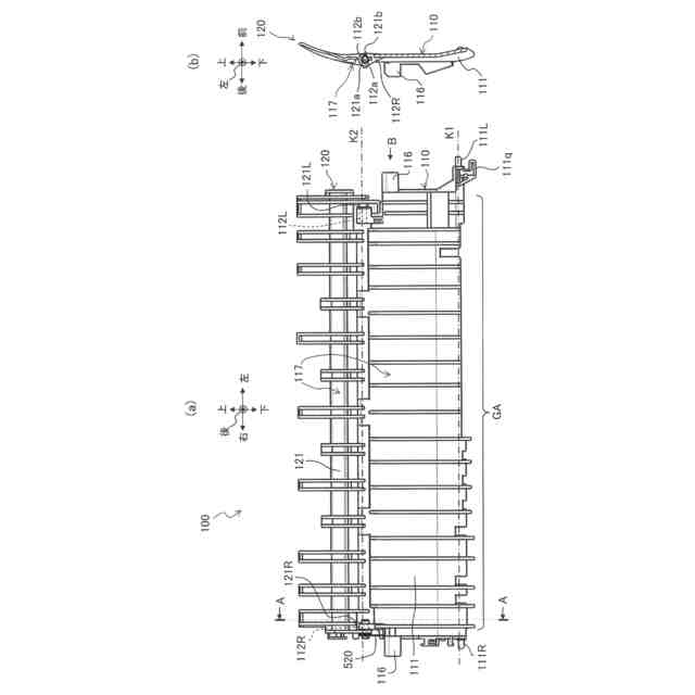 第2軸心が、先端部を付勢するねじりコイルバネ内を通る位置関係とすることで、搬送経路に干渉しないようバネを配置することができる。