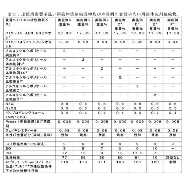 特開平0820795号は、ノズル付き容器に収容されたときに固化又はノズル詰まりを引き起こさず、長期にわたって安定に使用することができる洗剤組成物に関し、この洗剤組成物は、5~60モルのアルキレンオキシドに対する1モルのグリセロール又はジグリセロール付加物を0.1~10重量%含有する。米国特許第7938900(B2)号は、少なくとも1種の有機及び/又は無機顔料、分散剤及び/又は界面活性剤、三価以上の多価アルコキシル化アルコール、-ポリグリコールアルキルエーテル、所望により、ヒドロトロープオリゴマー及び/又はポリマー、所望により、脂肪、油、又は脂肪酸、所望により、水性顔料分散液の調製において典型的な更なる添加剤、及び水を含む水性顔料調製物に関する。中国特許第111518631(A)号は、エトキシル化及び/又はプロポキシル化モノ-及び/又はポリオールを含む洗剤組成物に関する。日本特許第7189610(A)号は、自動洗浄システムを備えた調理器具の内部を洗浄するのに十分な強度を有する固体洗剤組成物に関する。国際公開第2019/173688(A)号は、固体酵素洗剤組成物並びにそれを作製及び使用する方法に関し、洗剤組成物は、医療用及び歯科用器具を洗浄するために、並びに食器を洗浄するために特に有用である。欧州特許第3505609(A)号は、表面上に形成されたバイオフィルムの制御及び除去のための洗剤組成物に関し、洗剤組成物は、マンナナーゼ及び植物性活性成分の組み合わせを含み、それにより、両方の成分の組み合わされた作用が、開放領域及び閉鎖領域の両方において、表面に付着したバイオフィルムの除去において高い効率を提供する。日本特許第6955746号は、粉末洗剤組成物の流動性を改善し、スケールの生成を抑制し、粉末洗剤を少量で定量的に供給し、少量の洗剤であっても十分な洗浄力を有する、自動食器洗浄機用の粉末洗剤組成物に関する。中国特許第108690742(A)号は、ある種の光学ミラースリップ洗浄剤を開示している。中国特許第106833953(A)号は、抗菌脱臭羽根布団洗浄剤に関する。国際公開第2016/191238(A)号は、プロポキシル化グリセリンを含有する界面活性剤及び洗剤組成物に関する。スペイン特許第2464872(A)号は、表面上に発生したバイオフィルムの制御及び除去のための組成物に関し、組成物は、洗剤及び3つの酵素(リパーゼ、プロテアーゼ、及びα-アミラーゼ)の組み合わせを含み、それにより、両成分の組み合わされた作用は、開放領域及び閉鎖領域の両方において、表面上に付着したバイオフィルムの除去において高い効率を提供する。日本特許第5394133(A)号は、衣類などの織物に適した液体洗剤組成物に関する。日本特許第5324207(A)号は、自動食器洗浄機用の固形洗剤に関する。日本特許第2008156250(A)号は、グリセロールのアルキレンオキシド付加物及びアルキルベンゼンスルホネートの水溶液のための結晶化阻害剤としてのその使用に関する。日本特許第5213092(A)号は、顆粒状洗剤組成物、その製造方法、及び特に衣類、タオル、及びシーツなどの織物を洗浄するためのその使用方法に関する。国際公開第2008/021971(A)号は、洗剤供給装置を使用することによって、安定した濃度の洗剤溶液を自動洗濯機に供給することができる方法、当該方法において使用される自動洗濯機用の錠剤型洗剤組成物、及び当該組成物を用いた洗浄方法に関する。日本特許第4554498(A)号は、金属洗浄剤組成物、特に鉄、アルミニウム、銅などの金属バンド連続生産ラインにおいて主に使用される金属洗剤組成物に関する。日本特許第4810844(A)号及び日本特許第4810843(A)号は、良好な泡立ちを有し、すすぎ時にぬるぬるした感触を有さない、ボディソープ、ハンドソープ、洗顔料、ヘアシャンプーなどのための洗剤に関する。
