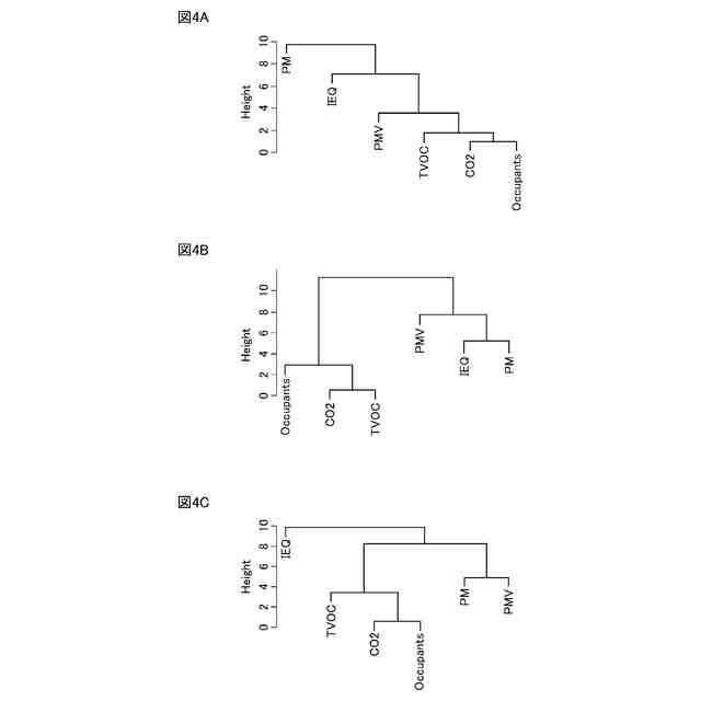 図4Aから図4Cは、室内空間となるオフィス1からオフィス3における各測定項目のクラスター解析結果を示す図である。