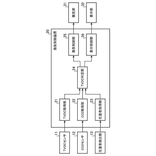 【解決手段】換気制御装置20は、TVOC濃度を取得するTVOC取得部21と、CO2濃度を取得するCO2取得部22と、在室者の存在有無に関する在室者情報を取得する在室者取得部23と、TVOC濃度、CO2濃度、及び、在室者情報に基づいて、取得したTVOC濃度に、室内空間を区画形成する建材等に由来するVOCの濃度が含まれているか否かを判定し、その判定結果に基づいて、換気制御部25及び表示制御部26を制御するTVOC判定部24とを備える。