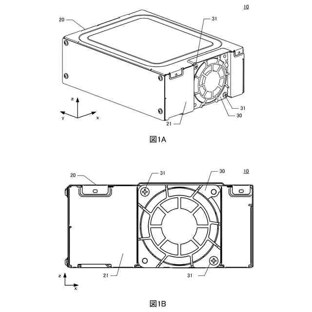 本発明の一実施形態にかかる電子機器10は、筐体20およびファン30を備えている。図1Aは電子機器10の斜視図、図1Bは電子機器10においてファン30が固定された面を見た状態の側面図である。図2Aは図1Bに示す面を、ファン30が取り外された状態において示した側面図である。図2Bは図1Bに示す面を、裏側から(筐体20の内側から)見た状態の図である。図3は、電子機器10の分解斜視図である。