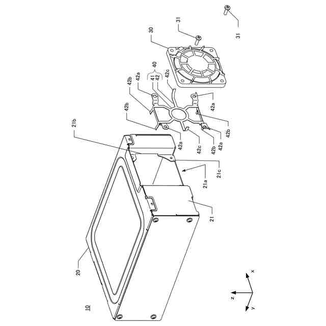 すなわち、筐体に設けられた開口部を通して、ファンによって筐体の内外の気体を流動させる構成において、開口部の形状を電磁シールド部材によって分割した分割開口部を形成する。電磁シールド部材は筐体に取り付けられることで筐体と電気的に接続するため、電磁シールドとして機能する。電磁シールドに開口部が存在する場合、当該開口部の開口径が電磁波ノイズの波長の1/2以上であると、筐体内の電磁波ノイズが外部に対して効率的に放射されてしまう。そこで、分割開口部の開口径が、電磁波ノイズの波長の1/2より小さくなるように構成されている。この構成によれば、分割開口部の開口径が電磁波ノイズの波長の1/2以上である構成と比較して、筐体から放射される電磁波ノイズを抑制することが可能である。