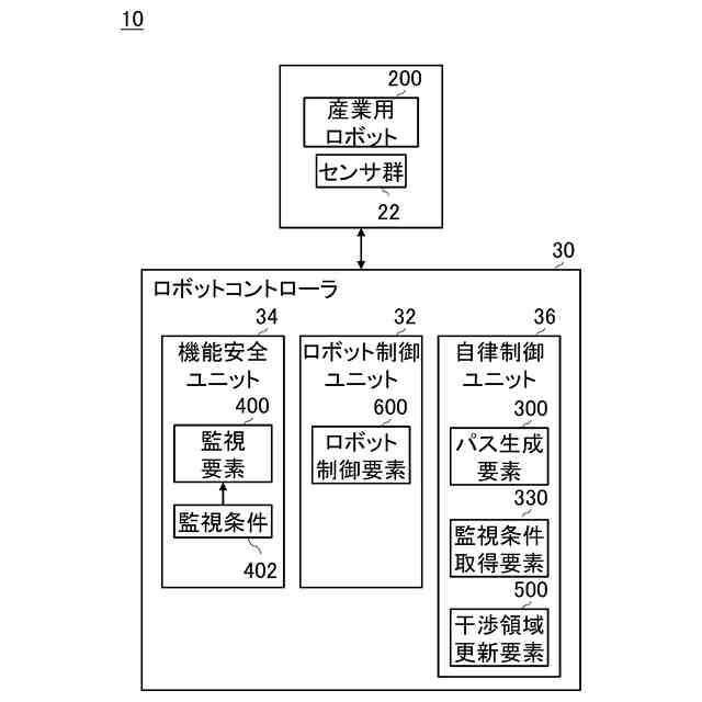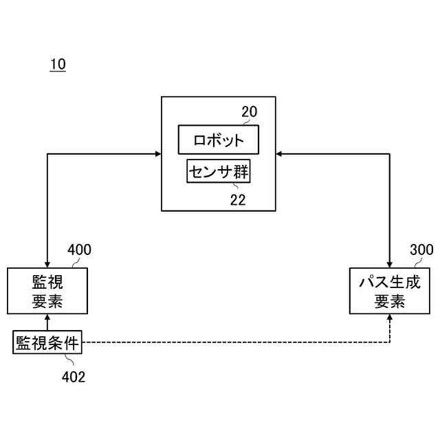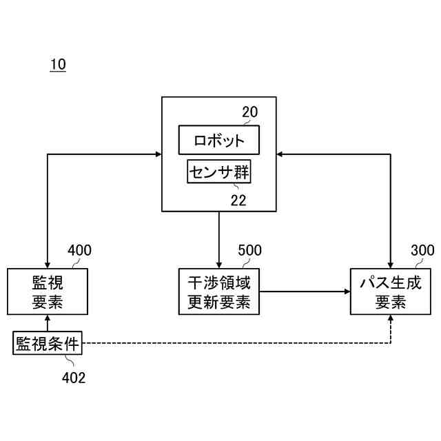 前記システムにおいて、前記パス生成要素は、前記ロボット周辺の干渉領域の情報を有してよく、前記干渉領域に加えて、前記監視条件を用いて前記動作パスを生成してよい。前記システムは、センサによるリアルタイムなセンシング情報に基づいて、前記干渉領域の情報を更新する干渉領域更新要素を更に備えてよい。前記パス生成要素は、更新された前記干渉領域の情報と、前記監視条件とを用いて前記動作パスを生成してよい。
