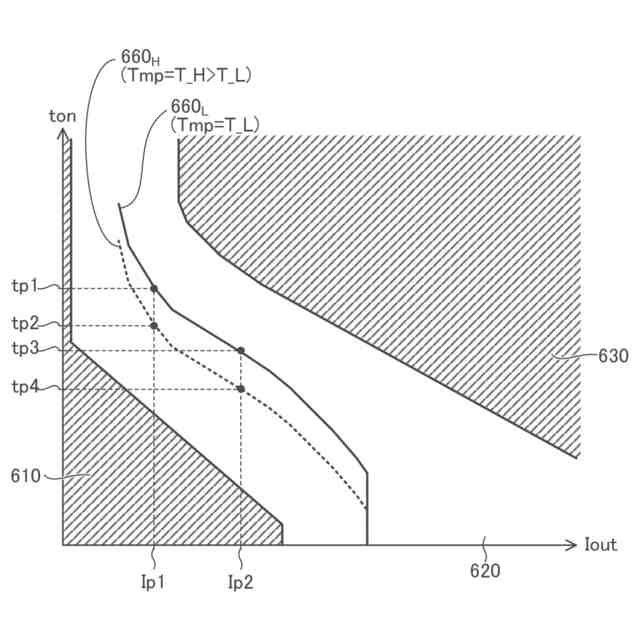 前記外部温度が第1温度である場合において前記出力電流が第1保護電流値を内包する第1特定電流範囲内に収まる状態が第1保護発動時間だけ継続したとき、前記保護動作を実行し、