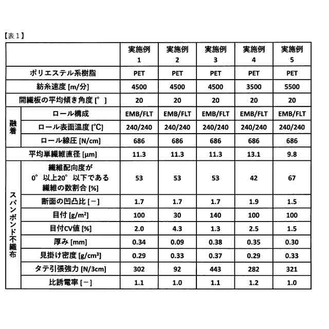 また、特許文献2では、ポリエチレンテレフタレートを主成分とした連続繊維が開繊された後、熱圧着により接合一体化されてなる不織布において、該不織布の構成繊維の固有粘度、最表層の繊維断面の扁平度と内層の繊維断面の扁平度との比、目付当たりの縦方向の引張強度、厚み当たりの縦方向の引張強度が一定以上であるスパンボンド不織布が提案されている。これによれば、ノーバインダーで、表面の平滑性を向上させ、かつ、繊維の強力も保持して、特定方向の不織布の強力が優れたスパンボンド不織布であるので、より強力が高いことが要求される電線用押え巻きテープ、印刷基材、ハウスラップなどの用途に安価な基布として提供できる不織布が得られるとのことが記載されている。