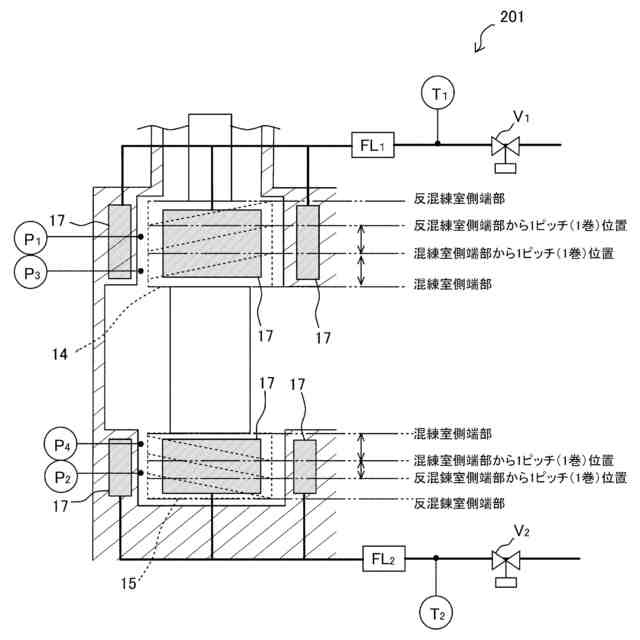 【解決手段】材料の混練が行われる混練室18を有するチャンバ2と、チャンバ2内に設けられたロータ3と、戻し部14、15と、を有し、戻し部14、15にはねじが形成されており、戻し部14、15はロータ3と共に回転することで、戻し部14、15から混練室側に材料を押し出すように構成されており、チャンバ2および戻し部14、15または両方に、チャンバ2と戻し部14、15との間に存在する材料を冷却する冷却機構(冷却装置17)が設けられる。