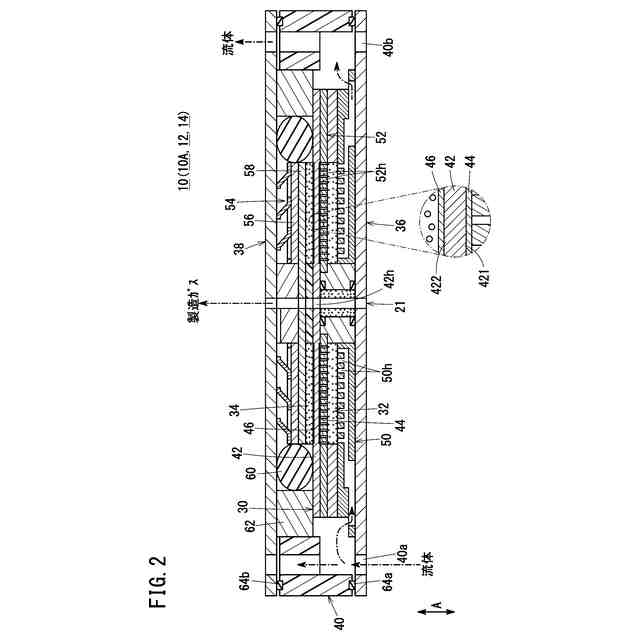 図1に示すように、差圧式電解装置10は、セル積層体12を備える電解スタック10Aとして構成されている。電解スタック10Aは、全体として略円柱体形状を有しているが、立方体形状等の種々の形状に設定可能である。セル積層体12は、鉛直方向又は水平方向に積層された複数の電解セル14を有する。電解セル14は、水電解セルである。電解セル14は、水素電解セルであってもよい。以下の説明において、「積層方向」は、複数の電解セル14の積層方向(A方向)を意味する。