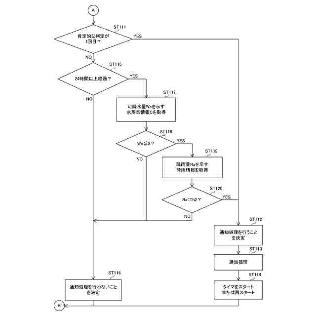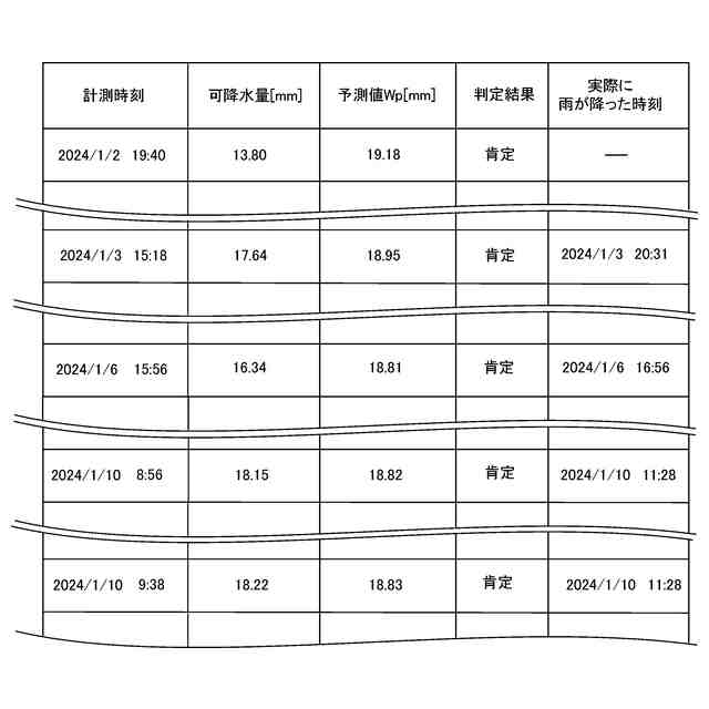 このように、水蒸気センサの計測結果に基づく予測値を用いて、将来の降雨に関する判定を行う構成により、たとえば、上空の気象状態に関する観測結果を用いて、シミュレーションにより当該判定を行う構成と比較して、上空の気象状態を観測するための、大がかりなレーダ装置を配備する必要がないため、降雨に関する判定を行うための設備を小型化することができる。また、判定結果を取得するまでに要する計算時間および労力を削減することができる。したがって、降雨に関する予測を簡単に行うことができる。