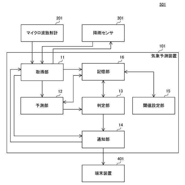 (1)本開示の実施の形態に係る気象予測装置は、水蒸気センサにより計測された、大気中における水蒸気量を示す水蒸気情報を取得する取得部と、前記水蒸気情報に基づいて、前記大気中における将来の前記水蒸気量の予測値を算出する予測処理を行う予測部と、前記予測値に基づいて、将来の降雨に関する判定処理を行う判定部とを備える。