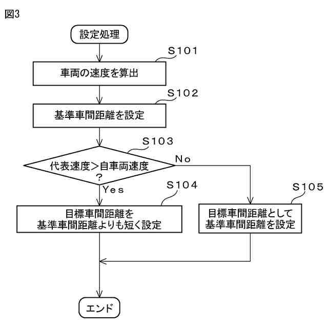 前記判定部によって、前記代表速度が自車両の速度よりも速いと判定された場合、自車両と自車両の前方に位置する前方車両との間の目標車間距離を、前記代表速度が自車両の速度以下の時よりも短く設定する設定部と、