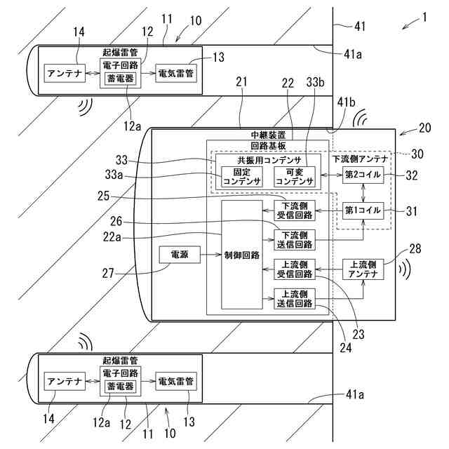 したがって共振用コンデンサに電気的に接続された第2コイルは、所定の周波数で共振する。そのため第2コイルは、共振する周波数の信号を効率良く無線で送受信できる。しかも第1コイルの巻数を少なくしてインピーダンスを抑制できる。第2コイルは、共振用コンデンサとの共振によってインピーダンスが小さくなるため巻数を多くできる。第2コイルが無線信号を受信する際、第2コイルで電流が流れて磁界が発生する。これにより第1コイルで電流が流れて第1コイルに信号が伝達される。第1コイルが信号を送信する際、第1コイルで電流が流れて磁界が発生する。これにより第2コイルで電流が流れて第2コイルが無線信号を発信する。かくして中継装置の下流側アンテナと起爆雷管との間で無線信号の送受信効率を高めることができる。
