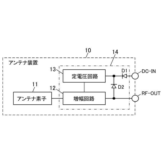 一方、電源重畳タイプの場合は、図4(B)に示すように、アンテナ装置10に信号と電源の共用端子DC/RFが設けられ、この共用端子DC/RFからダイオードD2を介して定電圧回路13へ直流電圧が供給されるように構成されていた。