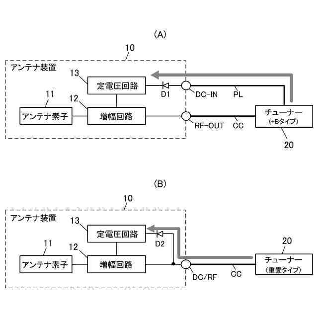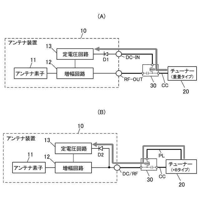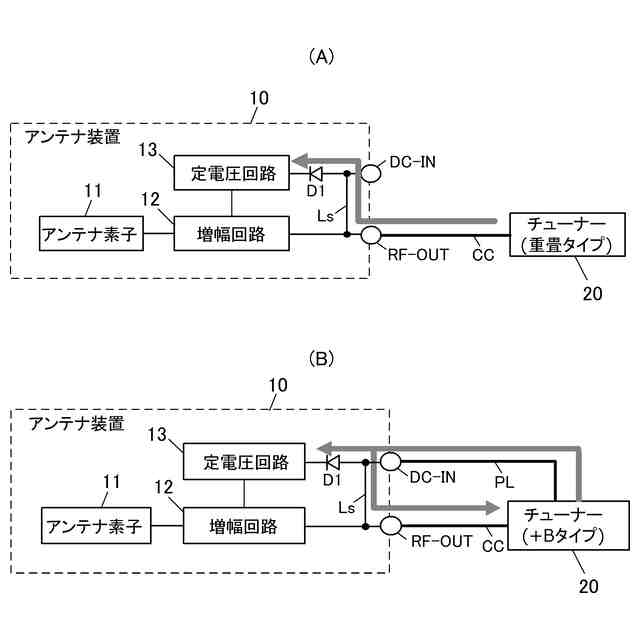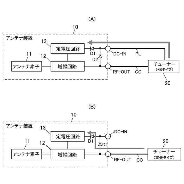 増幅回路を搭載したアンテナ装置に対する電源供給方式には、電源/信号分離方式と電源重畳方式とがある。電源/信号分離方式(以下、+Bタイプと称する)は、図4(A)に示すように、受信信号を伝送する同軸ケーブルCCとは別に電源線PLを設けてアンテナ装置10へ電源を供給する。電源重畳方式(電源重畳タイプ)は、図4(B)に示すように、受信信号を伝送する同軸ケーブルCCを用いてアンテナ装置10へ電源を供給する方式である。チューナーがどちらの仕様を採用するかによって、アンテナ装置の仕様が決定される。