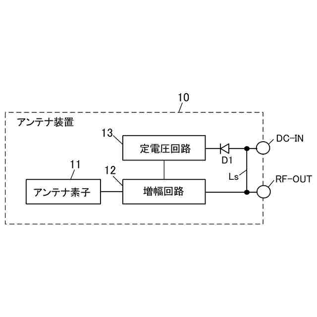 なお、+Bタイプのチューナーと電源重畳タイプのいずれのタイプのチューナーに対しても使用可能にするため、図5(A)に示す従来の+Bタイプのアンテナ装置10において、電源端子DC-INと信号端子RF-OUTとの間を直結するラインLsを設けた図6に示すような構成のアンテナ装置も考えられる。