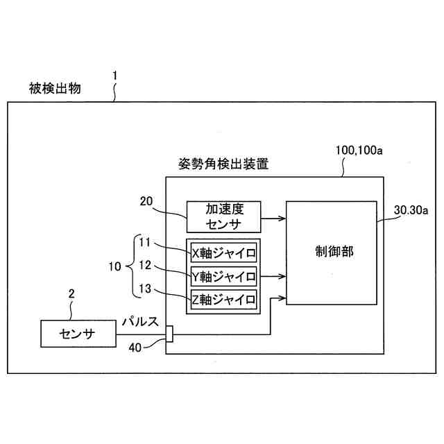 【解決手段】この姿勢角検出装置100は、被検出物1の速度に応じて発信されるパルスの周期に基づいて被検出物1の速度を算出する制御部30を備える。制御部30は、今回のパルスの周期が、前回のパルスの周期の1より大きい所定の倍率以上である場合、パルスが欠落していると判定し、前回のパルスの周期に基づいて、被検出物1の速度を算出し、前回のパルスの周期と今回のパルスの周期とに基づく加速度が、所定の加速度閾値以上である場合、パルスが過剰に入力されていると判定し、今回のパルスを無視する。