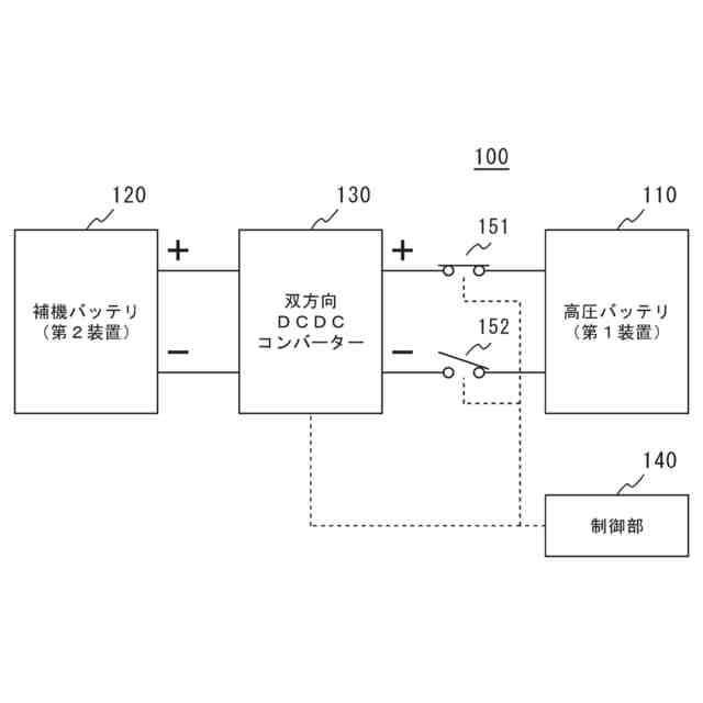 図1は、本開示の第1の実施形態に係る電力制御装置100の構成を示す概略図である。図1に例示した電力制御装置100は、高圧バッテリ110と、補機バッテリ120と、双方向DCDCコンバーター130と、制御部140と、第1リレー151と、第2リレー152と、を備える。