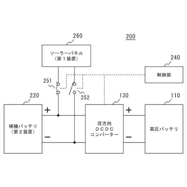 ソーラーパネルの発電電力を補機バッテリに充電する行為や、高圧バッテリの電力を補機バッテリに充電する行為などの制御には、充電電力が流れる電力線上に複数のリレーを設けることが一般的である。通常、これら複数のリレーには、駆動(ON動作)することによって電気的に導通させるいわゆるノーマリオフ型のリレーが採用される。しかしながら、このノーマリオフ型のリレーでは、充電行為などにおいて長時間に亘って導通状態を維持しなければならない場合には駆動電流を供給し続ける必要があり、消費電力が多くなるという課題がある。