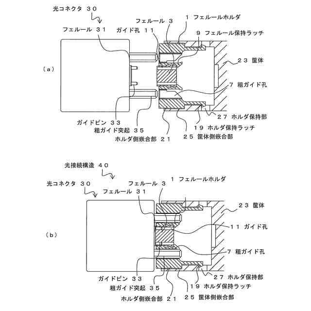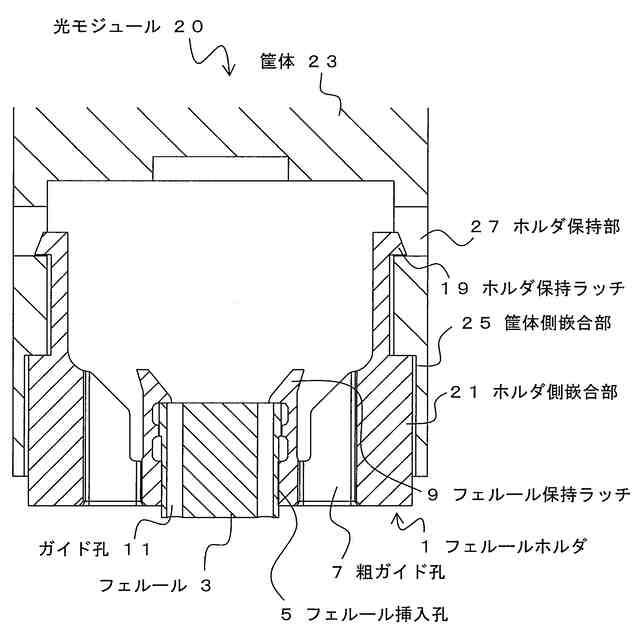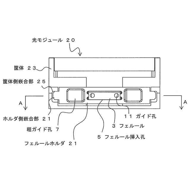 【解決手段】 フェルールホルダ1の両側面には、ホルダ側嵌合部25が設けられる。また、筐体3の前方の側壁部の内面には、筐体側嵌合部25が設けられる。筐体側嵌合部25は、筐体23の両側壁の内面にそれぞれ形成される溝である。筐体に23の内面に設けられた溝状の筐体側嵌合部25とフェルールホルダ1の外面に設けられた突起状のホルダ側嵌合部21とが嵌合することで、フェルールホルダ1が筐体23の所定の位置に配置される。ここで、ホルダ側嵌合部2と筐体側嵌合部25との間にはクリアランスが形成される。このため、筐体23にフェルールホルダ1を取付けた際に、フェルールホルダ1は筐体23に対して移動可能である。
