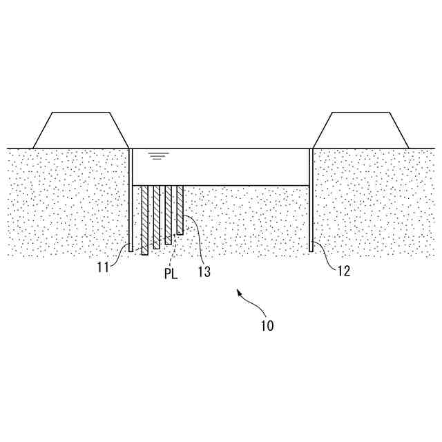 上記のような開水路の底部地盤の掘削にあたっては、両側に鋼矢板壁などの壁体を打設して安定させた上で、壁体の間を掘削して掘り下げることが行われている。この場合、壁体は掘削後の開水路の底部地盤から十分な受働土圧を受けられる深さまで打設する必要があるため、打設深さが深くなり、必要な材料が増加する傾向があった。また、例えば河川などの場合、掘り下げた後の開水路の底部地盤は延長方向について一定の勾配を維持していることが治水上好ましいが、水流による浸食や地震などによって底部地盤の形状が変化し、それによって勾配が一定でなくなってしまう場合があった。例えばセメントを用いた地盤改良工法を用いれば底部地盤の強度を向上させることができるが、地盤改良工法は水中での施工が困難であるため水流を迂回させるなどして底部地盤を空気中に露出させるドライアップが必要になり、またセメントプラントや打設重機のための広い施工ヤードも必要とされるため施工は容易ではない。また、地球温暖化対策としてのCO