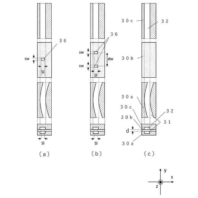 )で形成された第1のクラッド層である。この第1のクラッド層30aの一部をエッチング除去して第1の導波路31および第2の導波路32が埋め込まれている。またその上に第2のクラッド層30bが形成される。第1の導波路31はリング状であり、第2の導波路32は直線で構成される。第1の導波路31と第2の導波路32は僅かな隙間dを介して配置されている。なお、隙間dのy方向側面は、ドライエッチングで加工された面によって形成されている。また、第1の導波路31と第2の導波路32は3次非線形光学効果を有する材質で構成されており、その代表的なものは窒化シリコンである。(以下、この構成を水平結合のリング共振器と称する)。