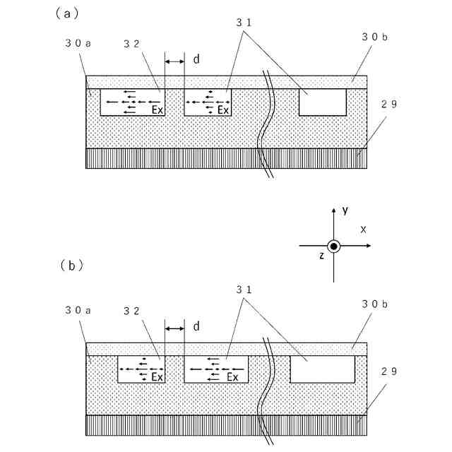 )で形成された第1のクラッド層である。この第1のクラッド層30aの一部をエッチング除去して第1の導波路31および第2の導波路32が埋め込まれている。またその上に第2のクラッド層30bが形成される。第1の導波路31はリング状であり、第2の導波路32は直線で構成される。第1の導波路31と第2の導波路32は僅かな隙間dを介して配置されている。なお、隙間dのy方向側面は、ドライエッチングで加工された面によって形成されている。また、第1の導波路31と第2の導波路32は3次非線形光学効果を有する材質で構成されており、その代表的なものは窒化シリコンである。