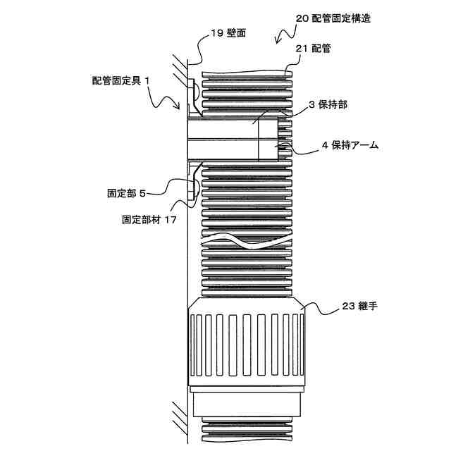 【解決手段】 配管固定具1は、例えば樹脂等で一体で構成され、保持部3、固定部5等から構成される。保持部3は、配管を保持する部位であり、上方の中央部に開口部7を有し、対向して配置される一対の保持アーム4からなるクリップ形状である。固定部5は、保持部3を設置対象に固定する部位である。一対の固定部5は、保持部3に対して、保持される配管の軸方向にそれぞれ突出するように配置される。保持部3に配管が保持された際に、配管によって、固定部5が隠れるように配管を保持することができる。