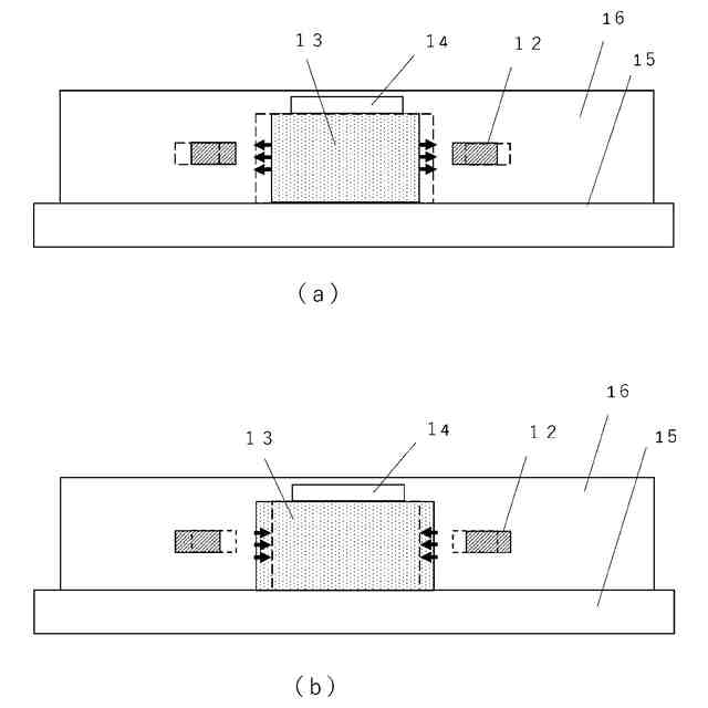 そのマイクロ光共振器を図14に示す。図14(a)は導波路の平面図であり、図14(b)は、x軸の断面図を表している。30aはシリコン基板29上に成膜された二酸化ケイ素(SiO2)で形成された第1のクラッド層である。この第1のクラッド層30aの一部をエッチング除去して周回型光共振器である共振器32および導波路31が埋め込まれている。その上に第2のクラッド層30bが形成される。共振器32はリング状であり、導波路31は直線で構成される。共振器32と導波路31は僅かな隙間dを介して配置されている。なお、隙間dのz方向側面は、ドライエッチングで加工された面によって形成されている。また、共振器32と導波路31は窒化シリコンで構成されている。