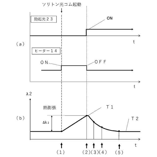 【解決手段】励起光の掃引を行わず、かつ直径が統計的な確立に基づいて無秩序に分布する同一呼び径の複数の第1から第n番目のリング導波路を設ける。この複数の第1から第n番目のリング導波路内に、熱変形アクチュエーターがそれぞれ設けられ、熱変形アクチュエーターがアクチュエーターヒーターで同時に加熱し、その後冷却することでソリトン光コムの立ち上げを行う。複数個ある第1から第n番目のリング導波路の中のどれか一つが励起光の波長がリング導波路のソリトン化領域に合わせればよいので、ソリトン光コム生成をより確実にできる。