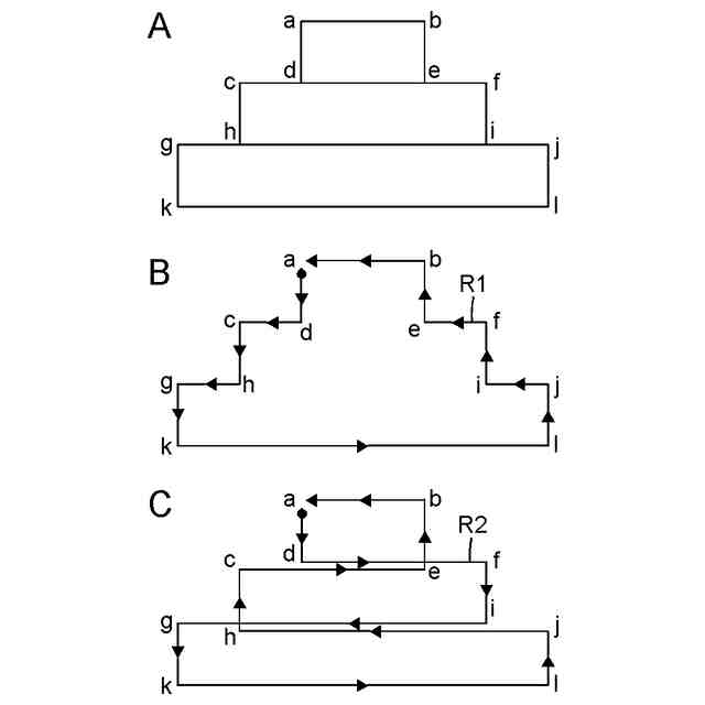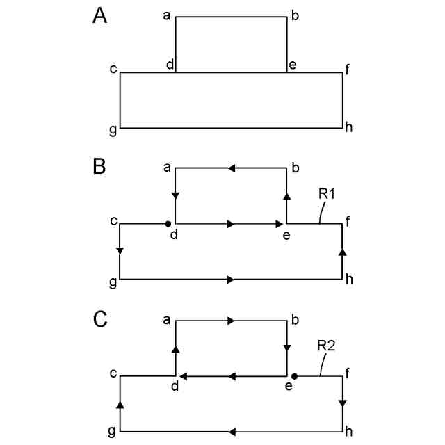 前記第1経路と前記第2経路はそれぞれ前記平面形状のすべての辺を1回ずつ通り、