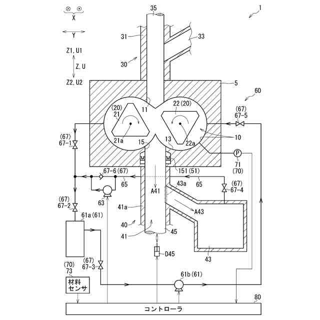 【解決手段】混合室10は、材料を排出するための混合室排出口15を有し、材料が混合される部分である。圧力センサ71は、混合室10の内部の流体の圧力を検出する。ドア45は、混合室排出口15を開閉する。材料排出部43は、混合室排出口15を通った材料が排出される部分である。ドア45が混合室排出口15を閉じた状態で混合室10の内部の流体の圧力が調整され、圧力センサ71に検出された圧力(P10)が設定圧力Psになった場合に、コントローラ80は、混合室排出口15を開くようにドア45を動かす。設定圧力Psは、材料排出部43の内部の圧力よりも高い。