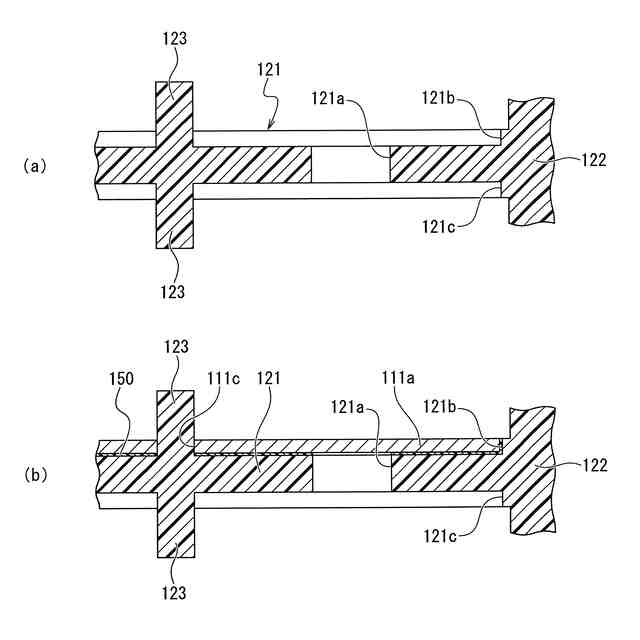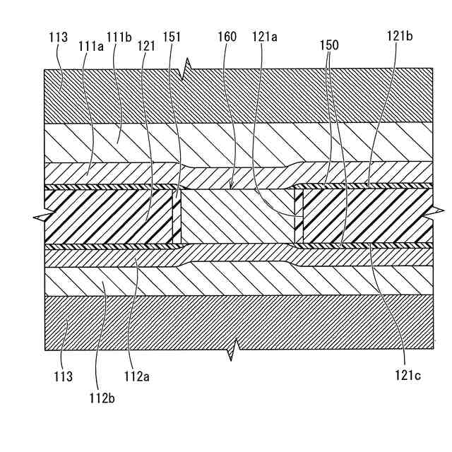 (3)前記基板は、厚さ方向に延びる柱状の貫通孔を有し、前記貫通孔に柱状の導通体が配置されている。前記導通体は、当該導通体の外周面と前記貫通孔の内周面との間に全周に亘って配置された接着剤により、前記貫通孔に固定されている。