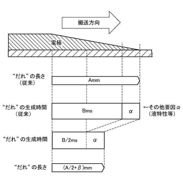 上記の特許文献1に記載された塗工装置では、切替バルブおよび塗工バルブ(間欠バルブ)を操作して、間欠的に、インク(塗工材)を塗工ヘッドへ供給することにより、いわゆる間欠塗工が実施される。そのような間欠塗工の製造技術を用いて、電池の電極が製造されている。例えば、ウェブ状の集電体に、電極を形成する材料(活物質)が間欠塗工される。その後、ウェブ材を切断して電極用活物質(塗工材)が塗工された部分を切り出すことにより、電池用の電極(あるいは、電極シート)が成形される。このような間欠塗工とウェブ搬送の技術を活用することにより、大量の電池用の電極を生産性よく製造することができる。しかしながら、上記のような間欠塗工によって電極を製造する場合には、例えば、図1に示すように、間欠塗工により、基材に塗工材が塗布された部分の末端では、塗工材の塗布量あるいは塗膜の厚さが減少する、いわゆる“だれ”が生じてしまう。このような塗工材の“だれ”は、間欠塗工の塗工開始時(塗工バルブの開弁動作時)と、間欠塗工の塗工停止時(塗工バルブの閉弁動作時)の両方で起こり得る(図1では、間欠塗工の塗工開始時に、塗工材が塗布された部分の先端で、“だれ”が生じるイメージを示してある)。そして、上記のような“だれ”が生じた部分では、電極のエネルギー密度が低下してしまい、ひいては、電池の性能や品質が低下する要因となってしまう。