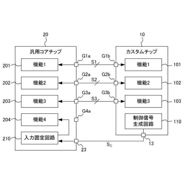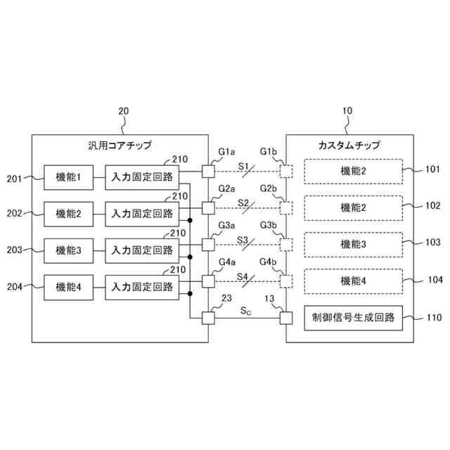 CPU(Central Processing Unit)及びメモリ等の汎用的な機能部を有する汎用コアチップと、特定機能を実現するための機能部を有するカスタムチップとがパッケージングされたマルチチップ構成の半導体装置が知られている。汎用コアチップは、汎用性を持たせるため、複数種のカスタムチップが備える全ての機能を備え、各機能に対応する信号をカスタムチップとの間で入出力するための複数のパッドを有する。汎用コアチップが有する複数の機能うちの一部の機能を有さないカスタムチップが汎用コアチップと組み合わされる場合、その機能は、汎用コアチップにおいて無効化される。汎用コアチップにおいて無効化される機能に対応する複数のパッドの入力値は固定する必要がある。無効化される機能に対応する複数のパッドの入力値を固定するために、これらの複数のパッドの各々に入力すべき固定値を出力する複数のパッドをカスタムチップに設けることが考えられる。しかしながら、複数のパッドを設けるために必要な領域の面積は比較的大きいものとなるので、カスタムチップの小型化が困難となる。また、カスタムチップが有さない機能のために、大面積の領域を確保するのは無駄である。