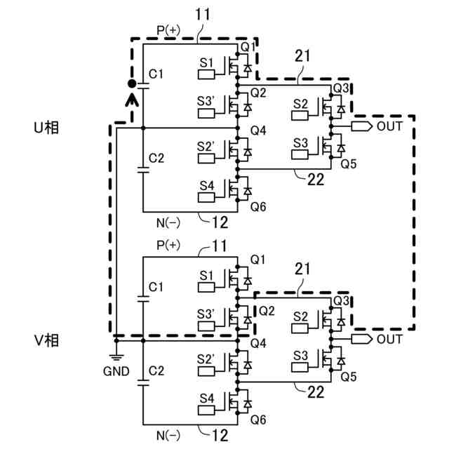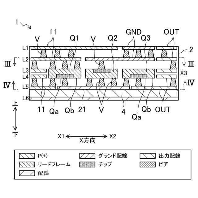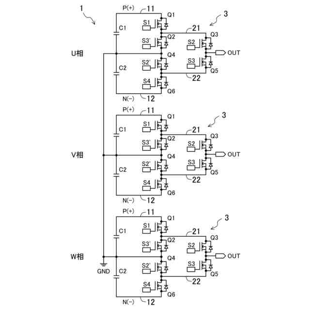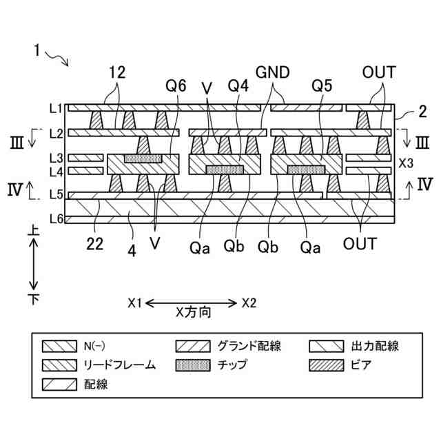 【解決手段】インバータ装置1は、表面に配線層L1が形成された配線基板2と、配線基板2に内蔵されたトランジスタQ1~Q6と、配線層L1の第1電源配線11とグランド配線GNDとの間に設けられた第1容量C1と、配線層L1のグランド配線GNDと第2電源配線12との間に設けられた第2容量C2とを備える。配線層L1では、平面視において、トランジスタQ1と重なる位置に設けられた第1電源配線11と、第4トランジスタと重なる位置に設けられた第2電源配線12の間にグランド配線GNDが設けられている。