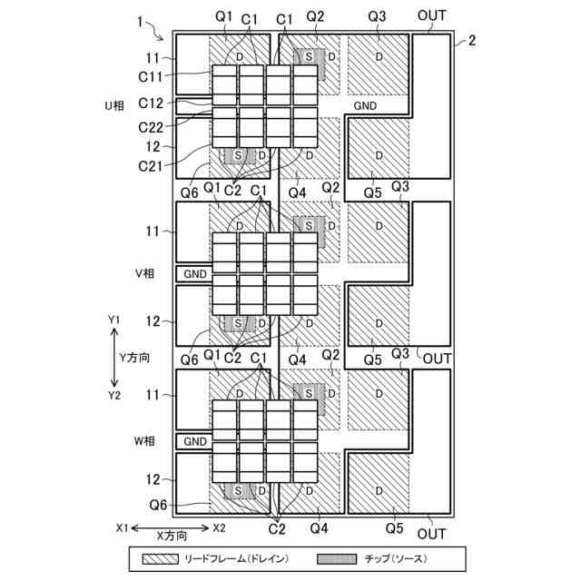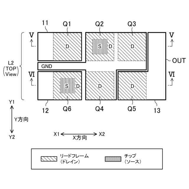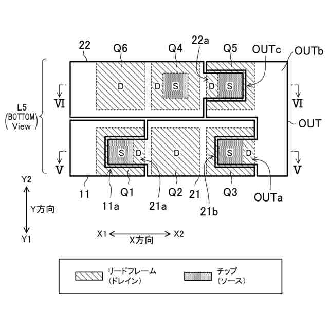 インバータ装置の1相分について、第5配線層の下から見た下面図