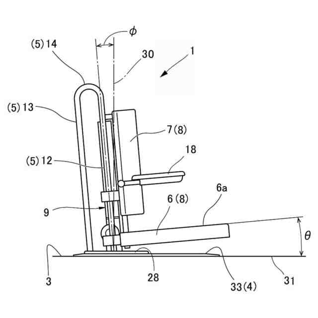 【解決手段】 装置本体部を保持するベース部4と、ベース部4から上方に向かって立設された一対の支持杆部5と、支持杆部5に上下方向にスライド可能に取り付けられ、座面部6と背もたれ部7とを有する座席部8と、ベース部4に対する座席部8の高さ位置を変化させるリニアアクチュエータ9と、を有し、支持杆部5がベース部4の垂直線30と為す傾斜角度φは、0゜以上15゜以下の後方傾き角度に設定されている。
