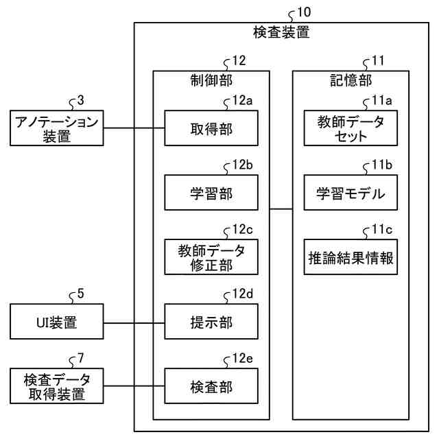 【解決手段】本開示の一態様による検査装置は、学習部と、推論部、重み付け部及び修正部を有する教師データ推定部と、を備える。学習部は、目的変数としてのラベルを含む教師データのデータセットを用いて学習モデルを学習する。推論部は、上記教師データのデータセットを用いた上記学習モデルによる推論を行う。重み付け部は、上記学習モデルの特徴量空間における上記教師データそれぞれに対応する第1特徴量と上記推論による第2特徴量との差が示す修正量を任意の重み値によって重み付けする。教師データ修正部は、重み付けされた上記修正量に基づいて上記ラベルを修正する。