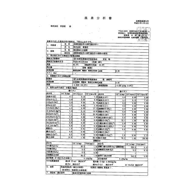 本発明の一実施の形態における鳥獣忌避剤の実施例の製造に使用された温泉水の分析書