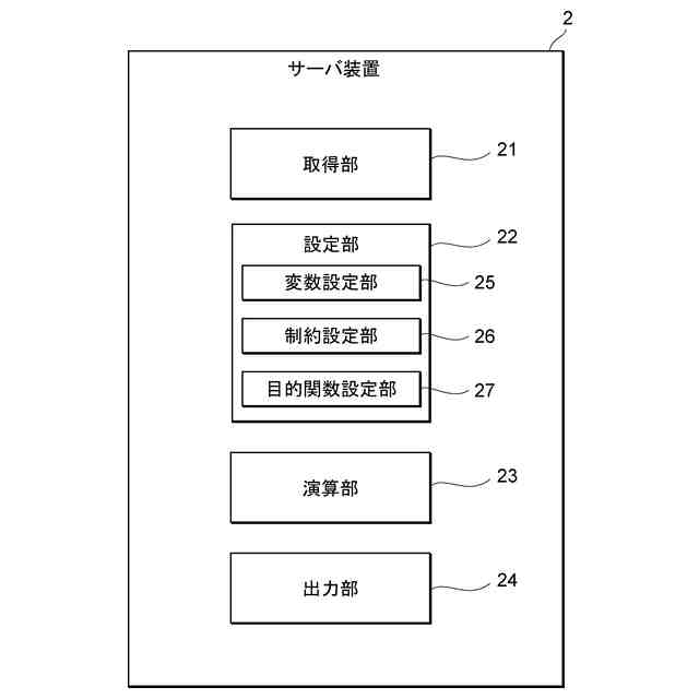 【解決手段】複数の積地から揚地へ原料を複数の船で輸送する配船計画を導出するサーバ装置2であって、各積地がグルーピングされた複数の積地グループに関する情報を取得する取得部21と、配船計画に係るパラメータを変数として含み、積地グループのそれぞれに対応した指標であって、積地グループに対する各船の寄港数の合計を示し、一つの船が同じ積地グループに属する複数箇所の積地に寄る場合、当該船の寄港数が複数箇所よりも少ない数としてカウントされる指標を設定する設定部22と、積地グループのそれぞれに対応する指標に関する項の和により設定される目的関数の値が小さくなるように、配船計画に係る各パラメータを導出する演算部23と、を備える。
