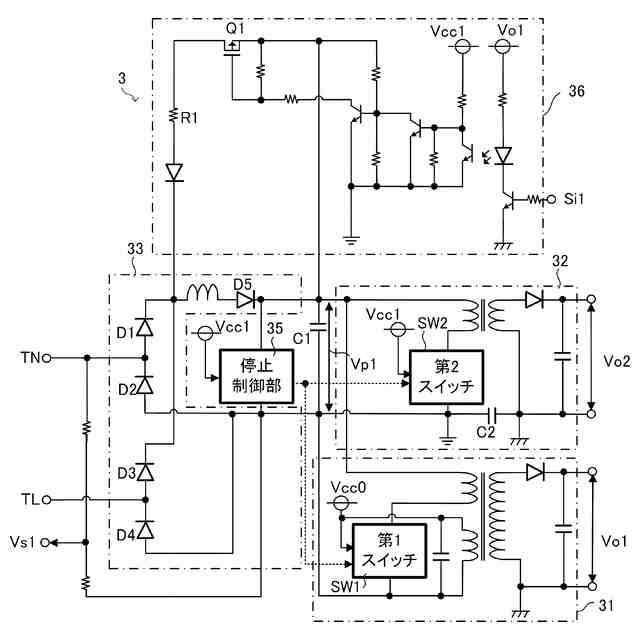 前記停止制御部は、交流電源におけるN極及びL極のうちの一方における前記交流電圧の大きさに基づいて前記第1電圧変換部及び前記第2電圧変換部の出力を停止させる、