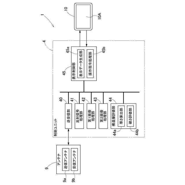【解決手段】地中レーダを用いた探査装置では、放射したレーダビームの舗装多層構造層からの反射信号に基づいて、舗装多層構造層の断面を示す2次元画像データを生成する反射信号処理部41と、2次元画像データにおいて地表面反射信号を抑制する抑制処理によって第1画像処理データを生成する第1画像処理部42と、第1画像処理データにおける舗装多層構造層の各層の境界を鮮明化する鮮明化処理によって第2画像処理データを生成する第2画像処理部43と、第2画像処理データから、舗装の厚さと路盤の厚さとを算出する厚さ算出部44aとを備える。