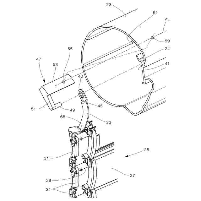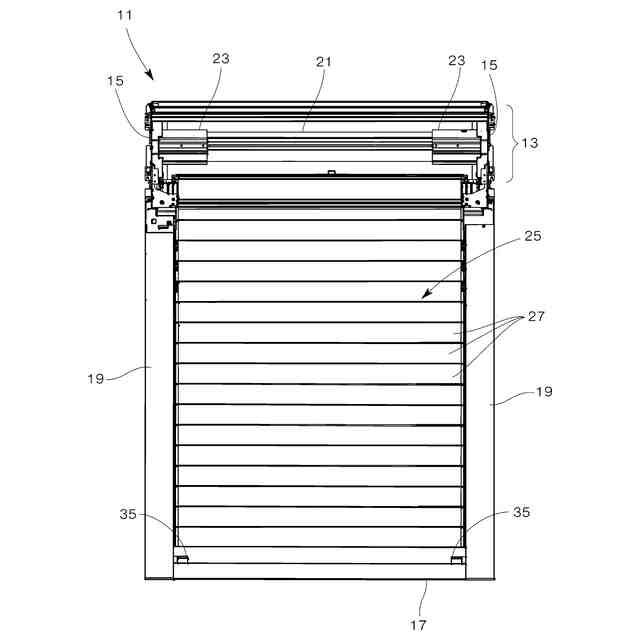 ここで、吊元リンク33のみは、吊元ドラム23に巻き重ねられるリンク31の軌道から、巻取ドラム21の外側にオフセットして配置される。これは、全閉状態で繰り出された開閉体25のリンク31が、巻き取り開始時には、一層目から吊元ドラム23の外周面に巻回されるようにするためである。これにより、開閉体25は、軸状突出部29を中心にスラット27と相対回転自在となるリンク31を一層目から吊元ドラム23に巻き重ねることができる。
