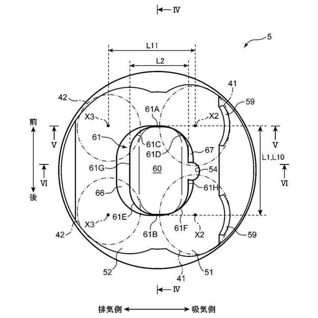 具体的に、2つの吸気ポートの開口部が前後方向に並設された燃焼室では、これら開口部の中間部分の吸気流速がその外側の流速よりも早くなりやすい。そのため、吸気ポート開口部の中間位置とこれよりも外側の位置とで吸気行程中の吸気の流れ方が不均等になり、外側位置においてタンブル流が傾くとともに中間位置と外側位置とでタンブル流の中心位置がずれやすい。吸気行程中の吸気の流れが不均等な状態では、圧縮上死点付近において燃焼室内に偏った吸気流動が形成されてしまう。つまり、燃焼室に良好なタンブル流が形成されない。