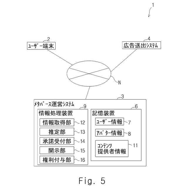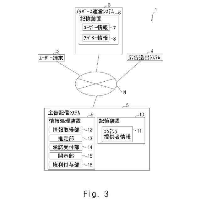 例えばメタバース等と呼ばれる、コンピューターによってインターネット上に構築された仮想空間では、広告等を含むコンテンツが提供される。ユーザーは、例えばアバター等と呼ばれる形態で仮想空間に参入する。アバターは、ユーザーのアクションを模倣したアクションを行う。