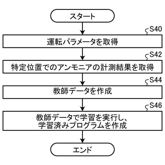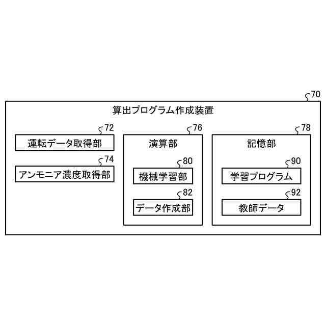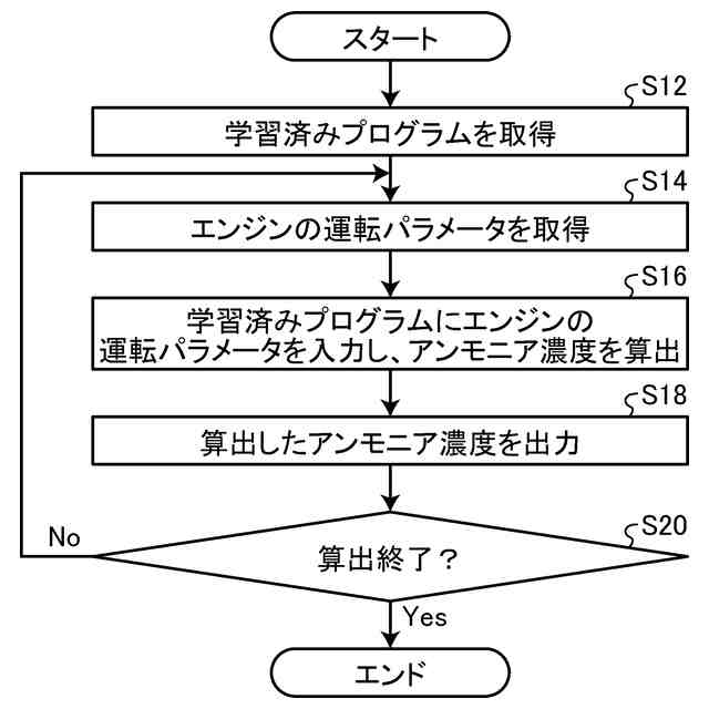 【解決手段】エンジンの未燃アンモニア濃度以外の複数の運転パラメータの運転データを取得するデータ取得部と、運転パラメータの運転データと排ガスの特定位置でのアンモニア濃度との関係に基づいて算出した、エンジンの運転データを入力とし、特定位置でのアンモニア濃度を出力とする算出法則を記憶する記憶部と、データ取得部で取得した運転データを記憶部に記憶された算出法則で処理して特定位置での排ガスのアンモニア濃度を算出する演算部と、を含む。