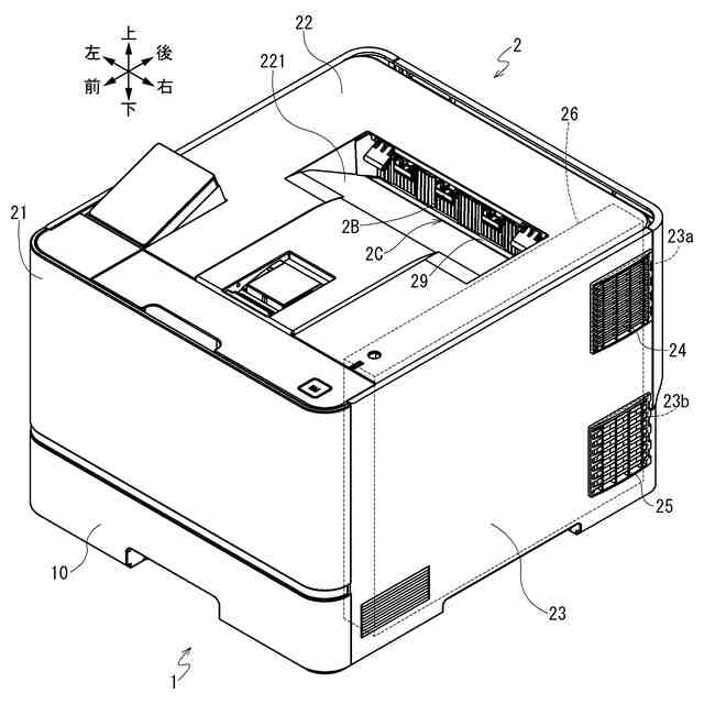 【解決手段】画像形成装置1は、第1ルーバー24を備える筐体2と、筐体2内の空気を筐体2外に排気する第1ファン71であって、第1ファン71による空気の第1排気方向において第1ルーバー24の上流側に配置され、第1排気方向の下流端に位置する第1下流端71aを備える第1ファン71と、第1排気方向に沿って延び、第1排気方向の下流端に位置する第2下流端27aを備え、第1ファン71を収容する第1ダクト27と、第1排気方向において第1ファン71と第1ルーバー24との間に位置する第1排気フィルタ73と、第1排気方向において、第1ダクト74および第1ファン71と第1排気フィルタ73との間に位置し、第1ダクト27の第2下流端27aおよび第1ファン71の第1下流端71aの少なくとも一方と第1排気フィルタ73とに接触する第1弾性体76とを備える。