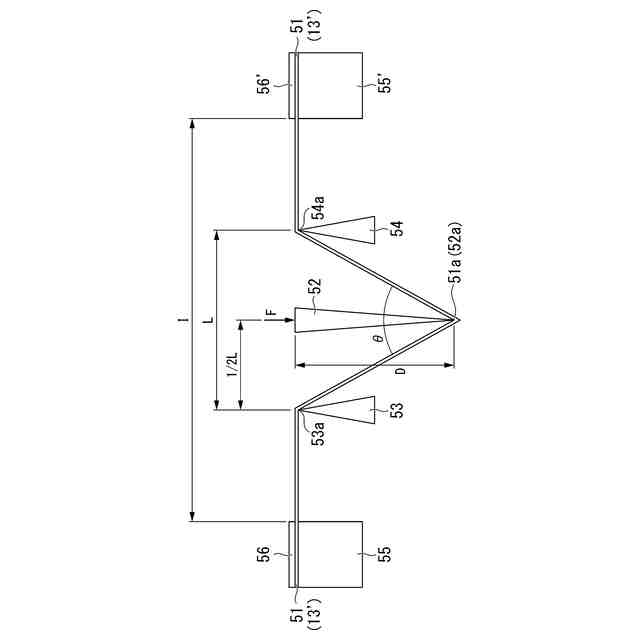 破断時曲げ角度測定の破断直前の試験片(51)の様子を模式的に示す断面図である。