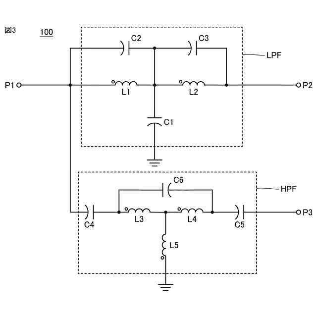 以下に、実施の形態に係るフィルタ装置の一例としてダイプレクサについて、図面を参照しながら詳細に説明する。なお、図中同一または相当部分には同一符号を付してその説明は繰り返さない。また、実施の形態に係るフィルタ装置は、ダイプレクサに限定されない。実施の形態に係るフィルタ装置は、以下に説明するローパスフィルタの構成を少なくとも含んでいればよい。また、以下に説明するローパスフィルタは、3次のT型LCフィルタ回路を用いて説明するが、5次のT型LCフィルタ回路や、より高次のT型LCフィルタ回路であってもよい。